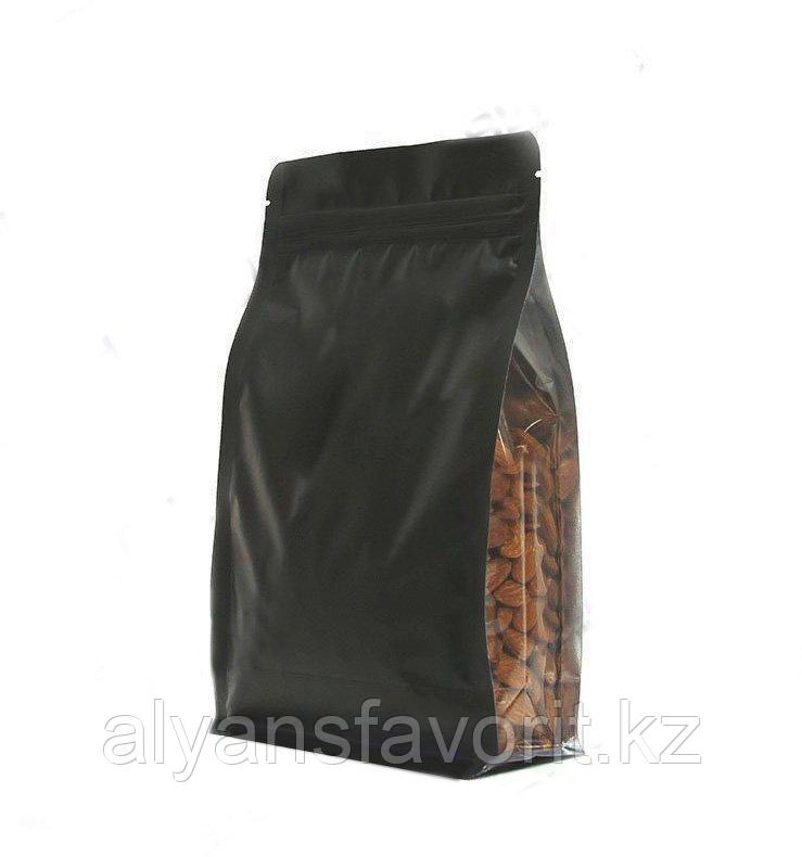 Металлизированный черный матовый квадропак с прозрачными фальцами на 250 гр. зернового кофе.