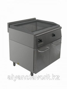 На панели управления расположена емкость для слива излишков жира. Жарочная поверхность оснащена двумя нейтральными шкафами с дверцами, в которых можно хранить посуду и кухонные принадлежности.